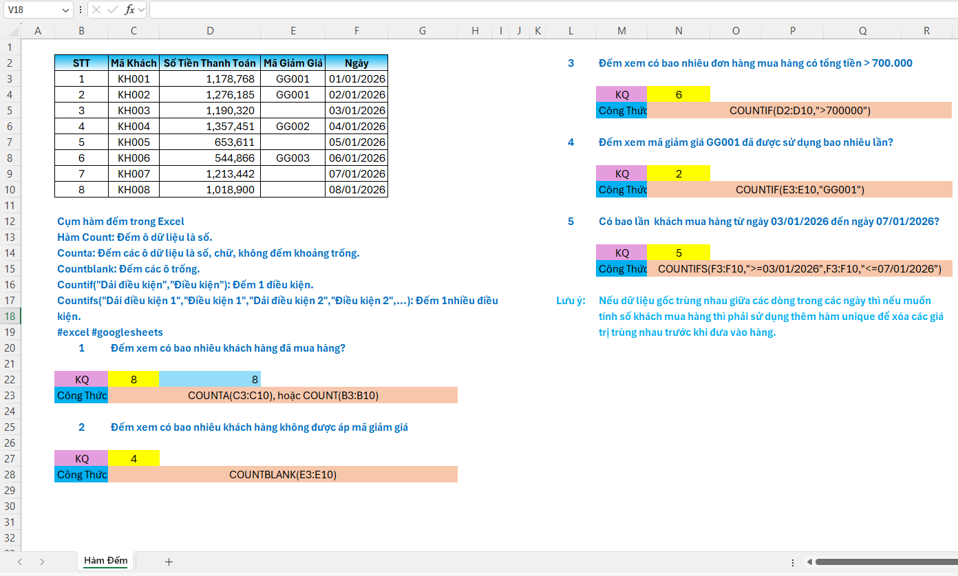 Cụm hàm đếm trong ExcelHàm Count: Đếm ô dữ liệu là số.Counta: Đếm các ô dữ liệu là số, chữ, không đếm khoảng trống.Countblank: Đếm các ô trống.Countif(“Dải điều kiện”,”Điều kiện”): Đếm 1 điều kiện.Countifs(“Dải điều kiện 1″,”Điều kiện 1″,”Dải điều kiện 2″,”Điều kiện 2”,…): Đếm 1nhiều điều kiện. Tải File Mẫu