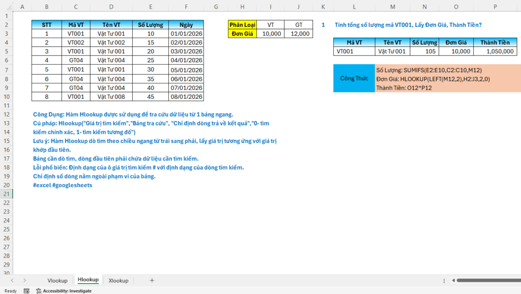 Công Dụng: Hàm Hlookup được sử dụng để tra cứu dữ liệu từ 1 bảng ngang.