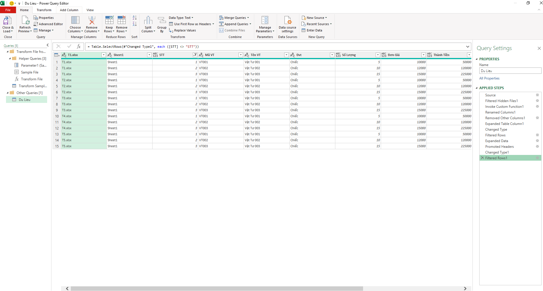 • B2: Thực hiện các bước biến đổi, làm sạch dữ liệu: Lọc theo tên file, mở rộng bảng combine, lọc cột tiêu đề,..