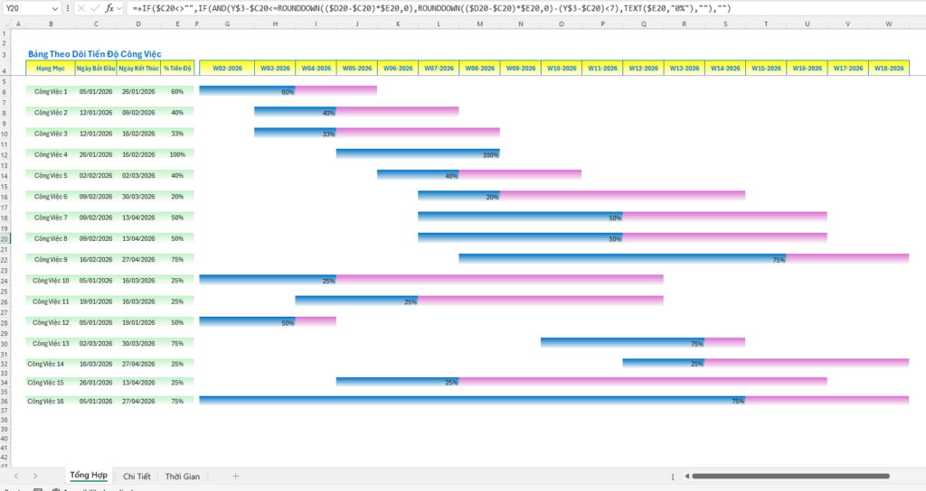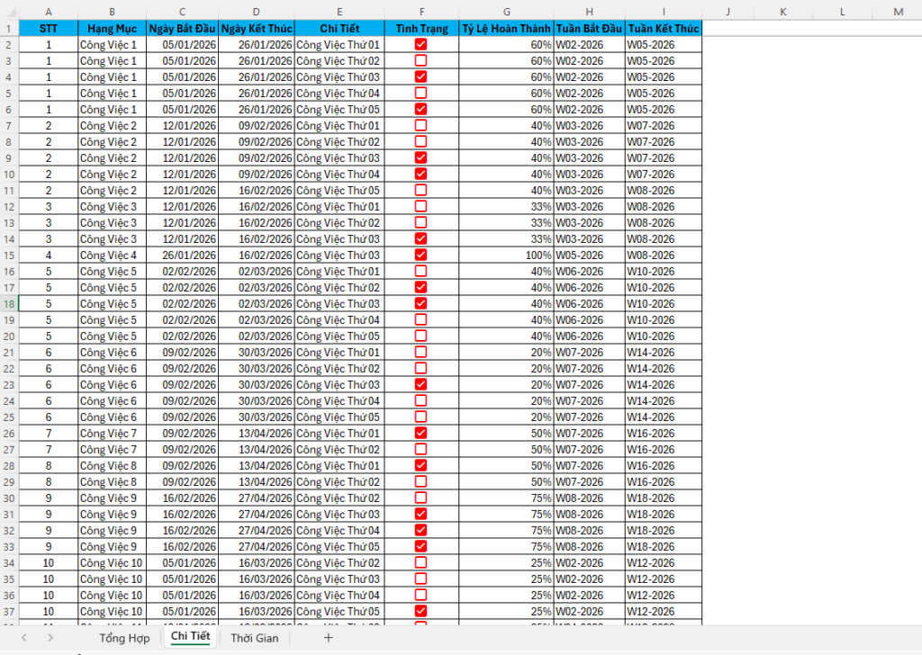 • Sử dụng hàm động để tự động cập nhật hạng mục, trục thời gian theo tuần.