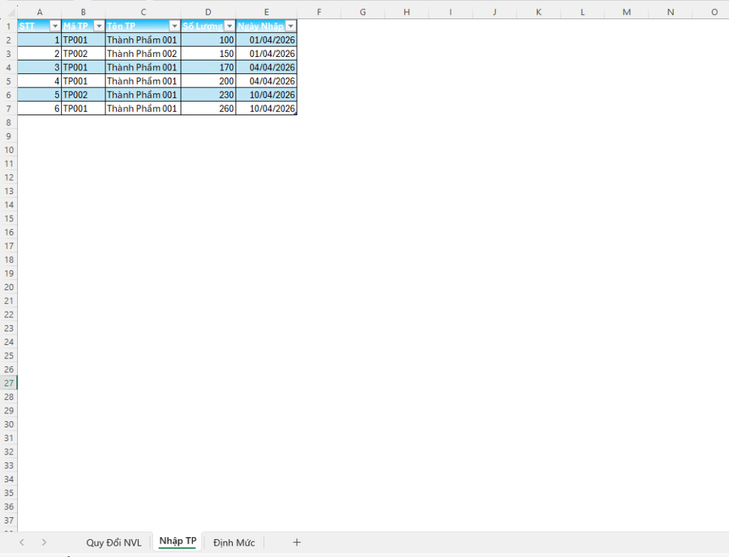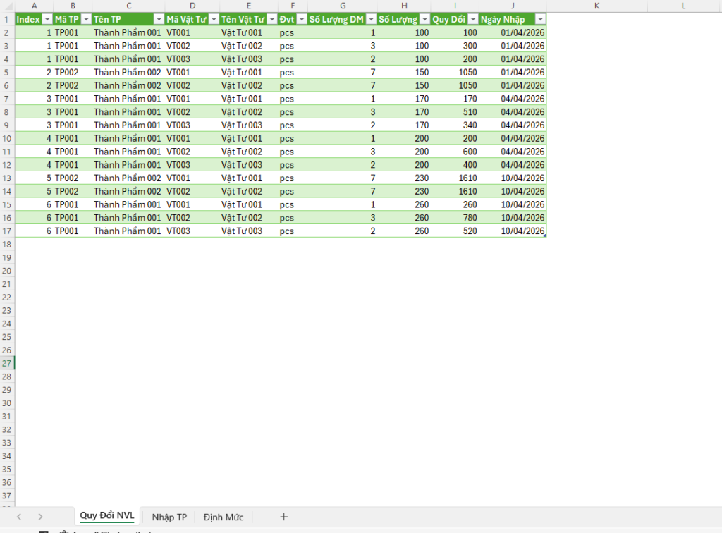 - Danh sách quy đổi giữ nguyên theo thứ tự ngày nhập thành phẩm. Dễ dàng đối chiếu so sánh.